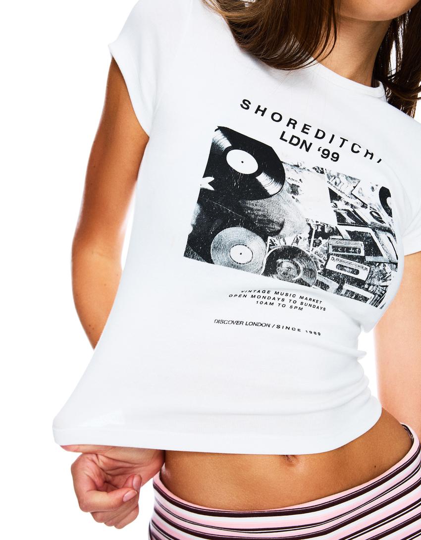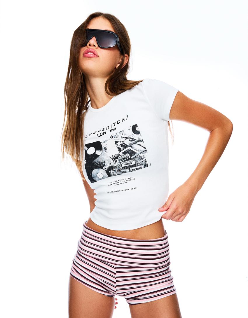 El streetwear se encuentra con la nostalgia en esta camiseta corta con gráfico estilo retro de la cultura del vinilo. Su fit ajustado y cuello redondo clásico hacen de esta prenda una pieza esencial para looks frescos, atrevidos y sin esfuerzo. Perfecta para quienes sienten la música en la piel y viven en movimiento.